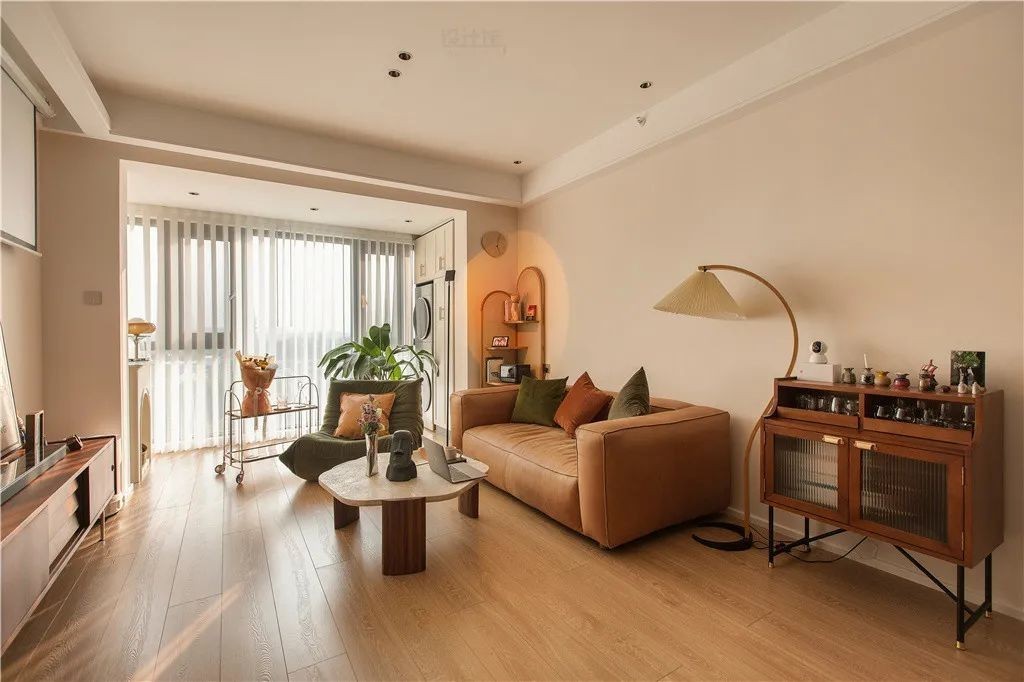 这是一套107平米的现代复古风装修案例,整体硬装以简洁为主,通过大胆的粉咖色墙面乳胶漆的搭配,再加入清新优雅的软装布置,营造出一种独特优雅的氛围效果。