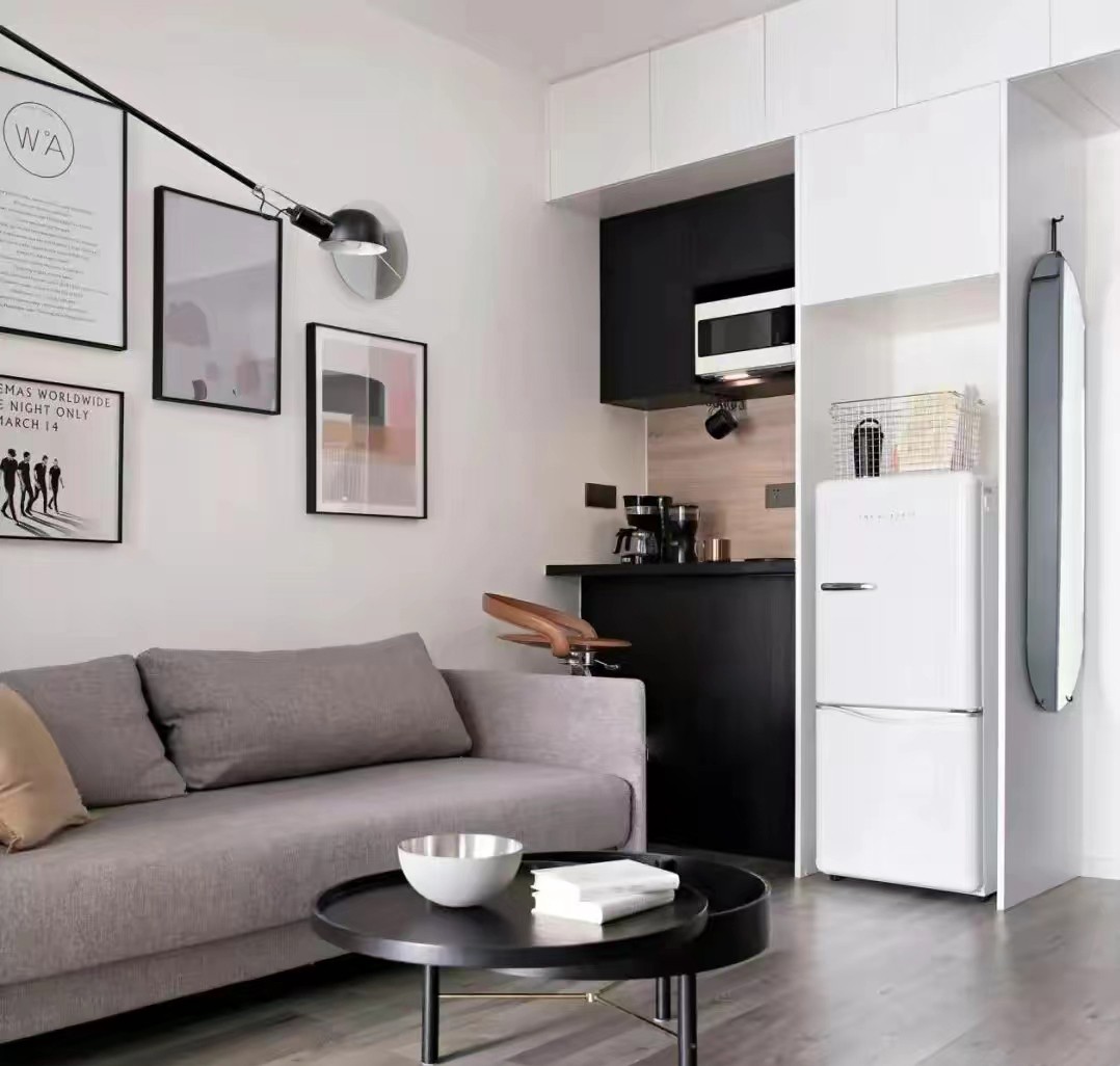 进门右侧区域做了一个西厨区,将冰箱放置在这里,而靠墙处则是打造了一个小的吧台,放置着咖啡机和微波炉。 夫妻俩可以在这里享用咖啡、糕点,同时也可以作为小餐桌使用。