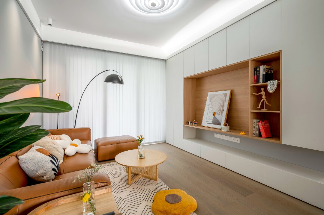 顶面主灯+明装筒灯+反灯槽的设计能够满足大多数场景的照明需要,客厅落地台灯和太阳灯能够在适当的时候营造更好的氛围,在自然采光上梦幻帘的使用让客厅更具设计感。