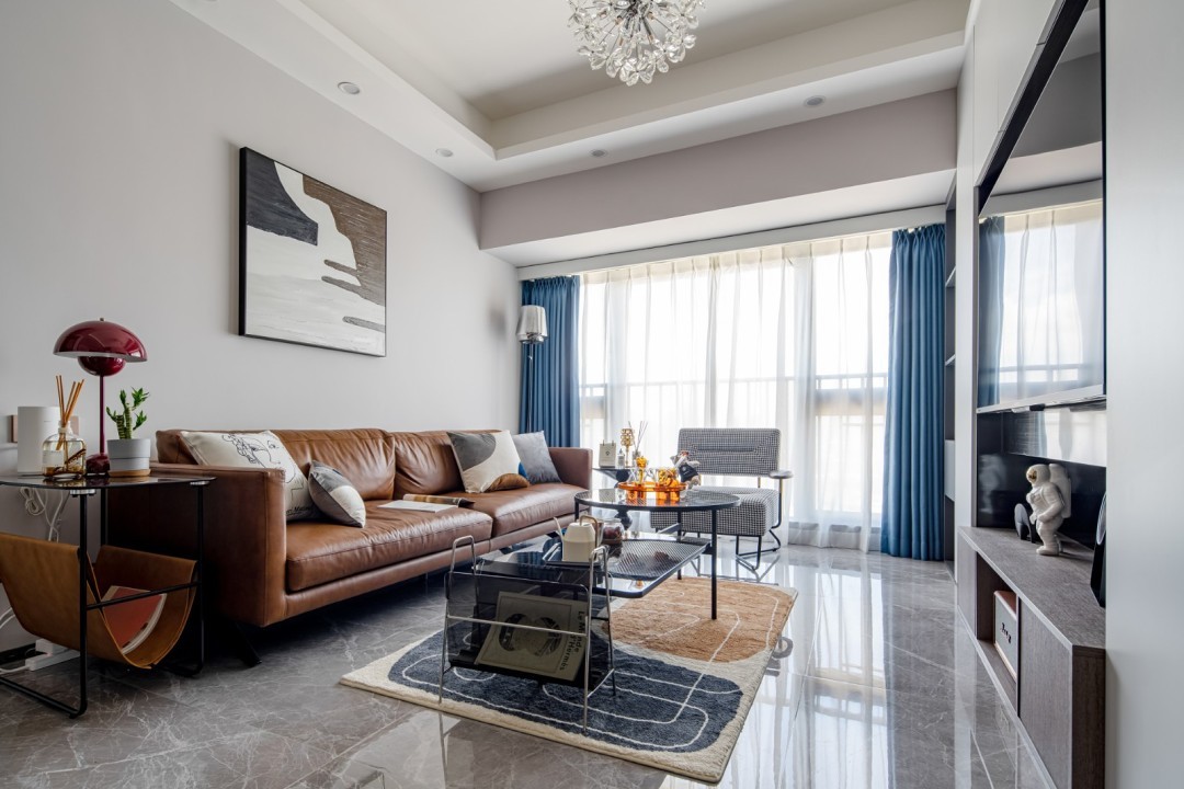 取消电视和沙发背景造型,改用简单大气的浅灰色墙漆打底,平柱到顶的电视柜,满足收纳的同时让空间更加规整。