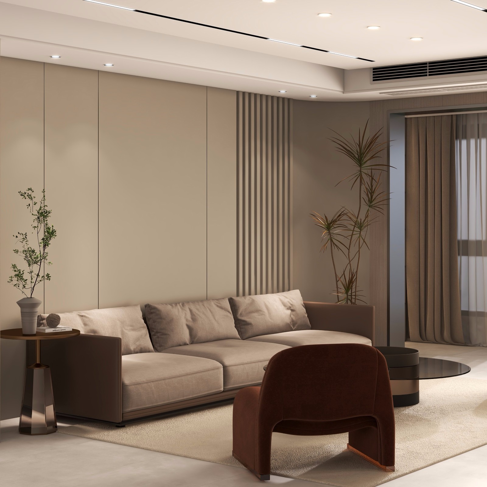 沙发背景墙用了纯色护墙板和格栅结合,增添了细节。