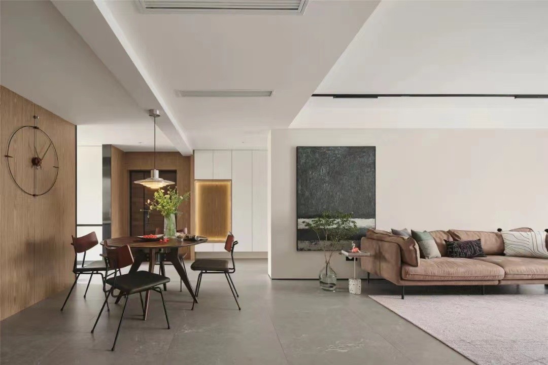 客厅微微凹凸的哑光灰釉面砖作为地面铺陈,让落地的光线拿掉了一部分锐度,以一种更加柔和的方式被我们感知。