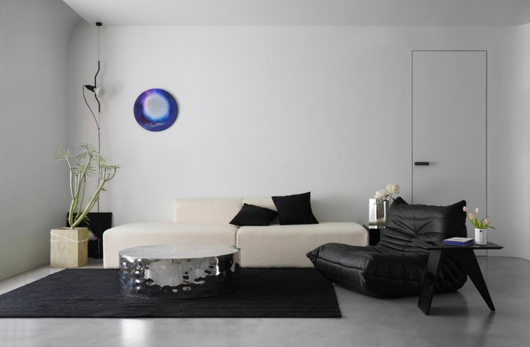 客厅没有做过多的硬装修饰,墙面用弧形过度顶面,顶面错层设计,预留灯带和弧形呼应,空间用了大面积的留白,软装搭配是主要灵魂。灰色硬装基调下,软装用了***块的黑白两色为主,局部点缀了蓝色的装置艺术挂镜,绿色的植物,让单一的画面更加生动。