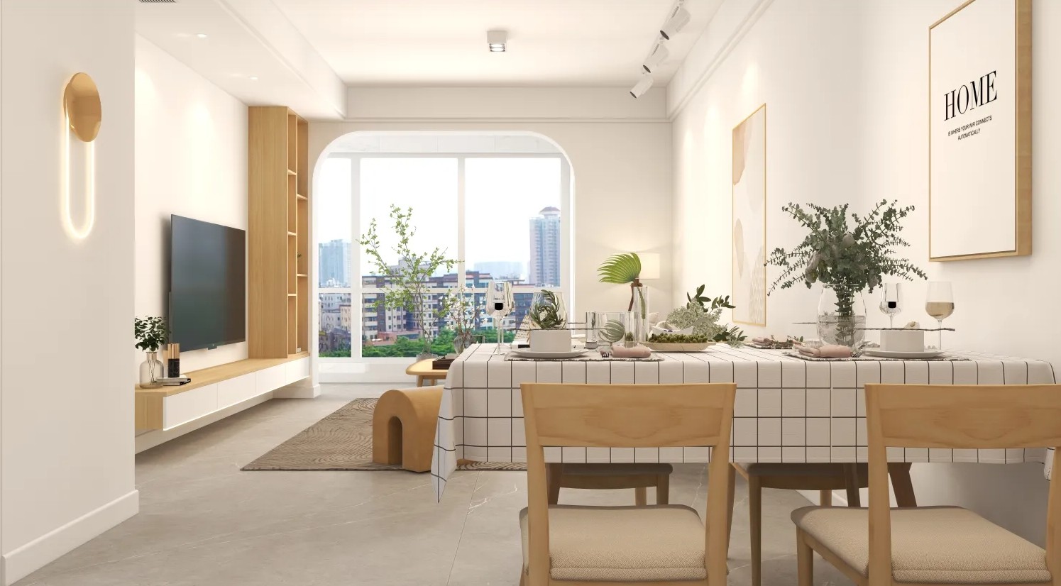 门洞都采用的拱形门的设计,电视柜旁边的置物架清新且自然。