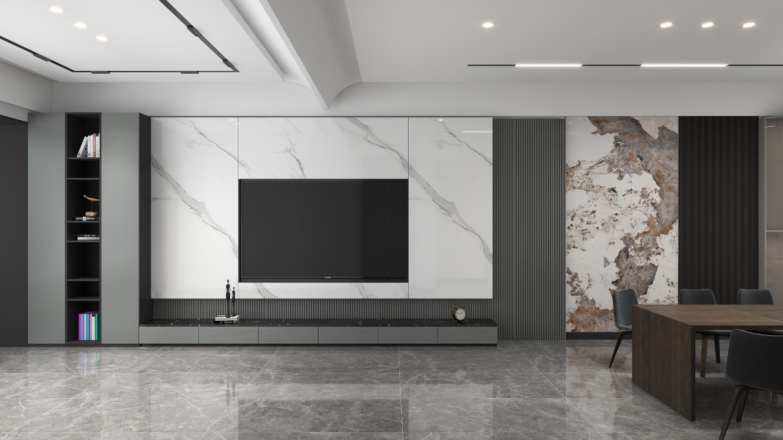 建筑面积145平方。三方两厅两卫一厨,满足家庭人口需求。整体黑白灰色调,半开式厨房,中岛一体。