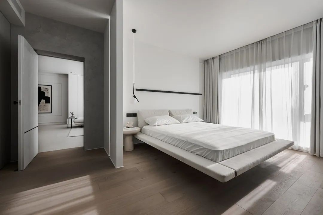 电视墙和主卧隐形门选用了艺术漆做底,入户的隔墙给视觉一个缓冲,中间留有间隙,从早到晚体验微妙的光影变化,每次推门都是惊喜。