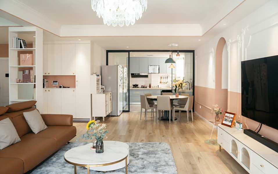 将卫生间干区用上了粉色的外墙漆已经水磨石瓷砖。