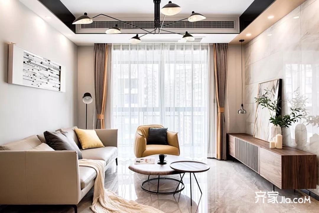 客厅以薄暮灰作为基调,点缀一抹暖色,让整个空间演绎现代优雅的同时增加空间彩度。