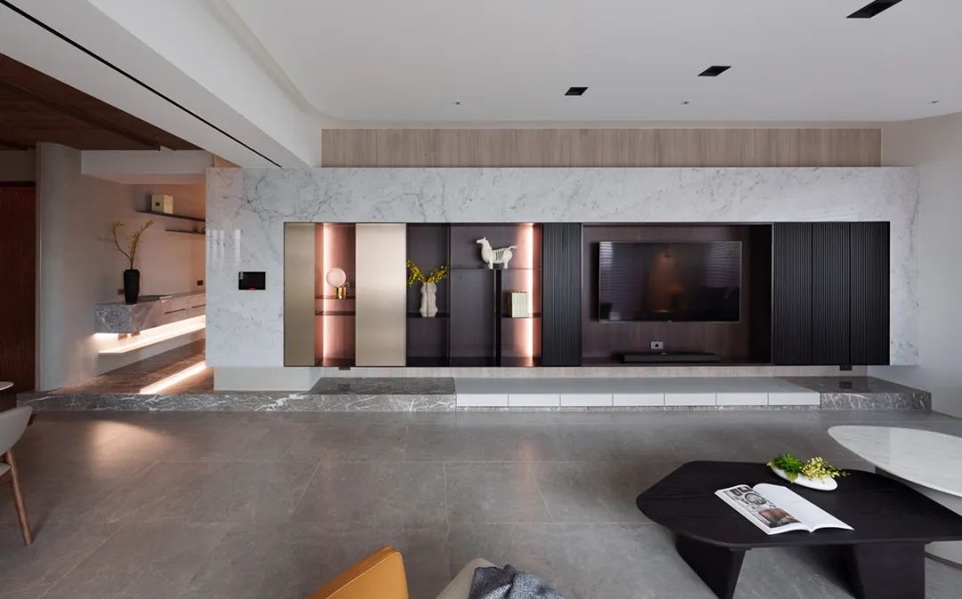 褐木皮与格栅空间妆点电视墙 也修饰结构柱体,营造放大拉阔的视觉效果 木纹与石纹相偕共织人文雅致韵调 左侧设有开放展示柜便于屋主摆放家饰品,灵活变化出一隅端景