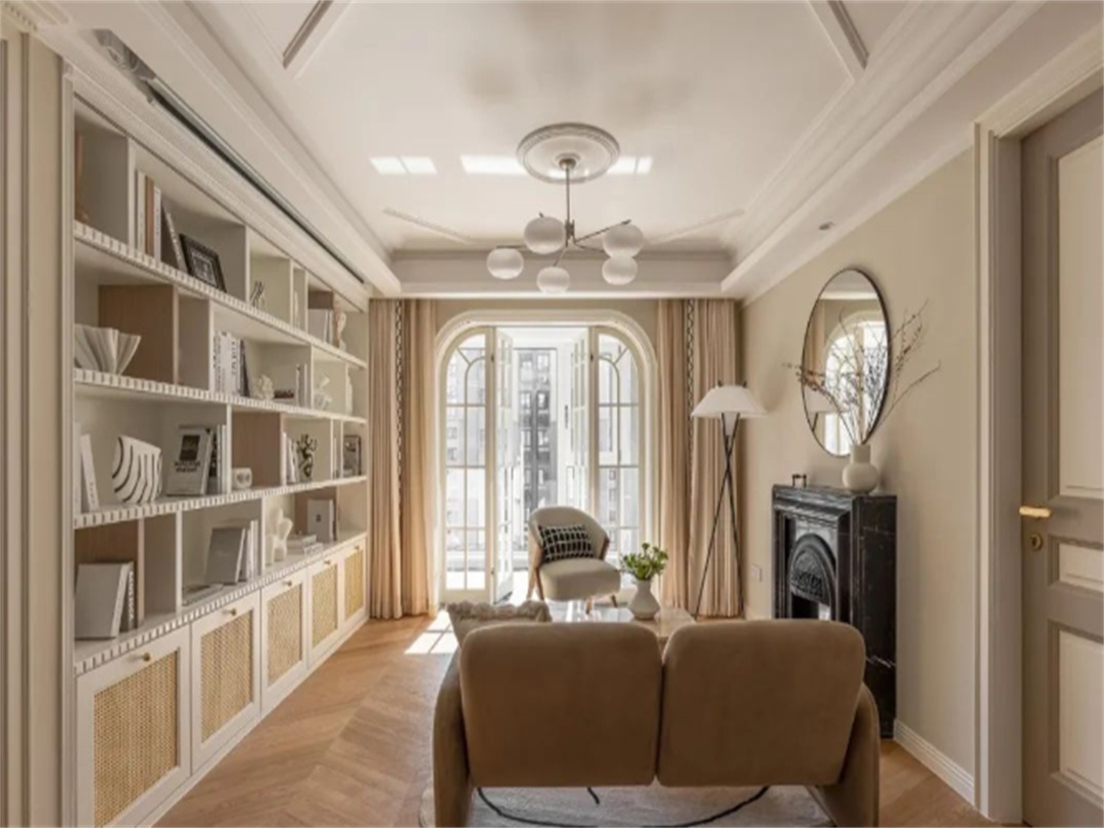 客厅围合式布局,更加贴近人和人之间的交流互动,开放式书架成为视觉焦点
