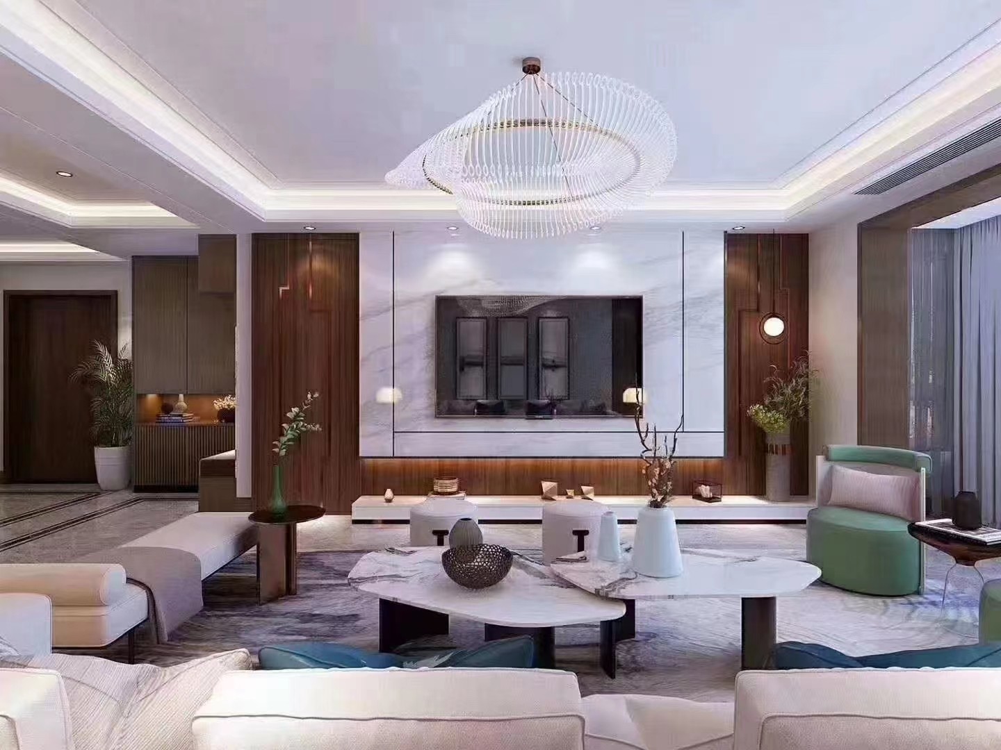 新中式客厅采用线条进行搭配,胡桃色进行点缀
