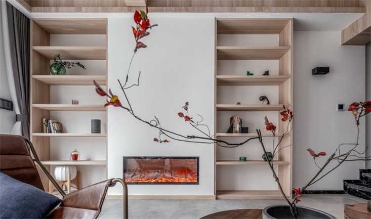 壁炉的火光下,木质和织品显得更加温暖,现代感的家具也被赋予了慢节奏的惬意感。