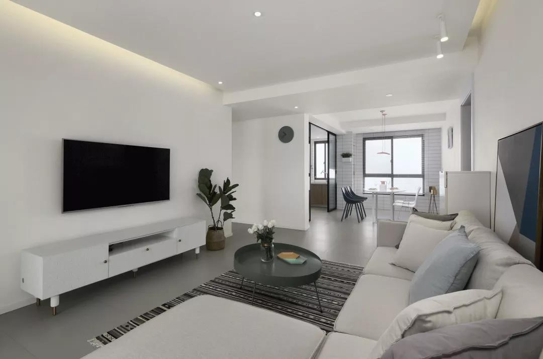 客厅的电视柜、茶几和沙发都是非常简单的款式,上方也没有做主灯,而是在两侧加上了灯带和中间的暗装筒灯,让客厅更有极简风的感觉。