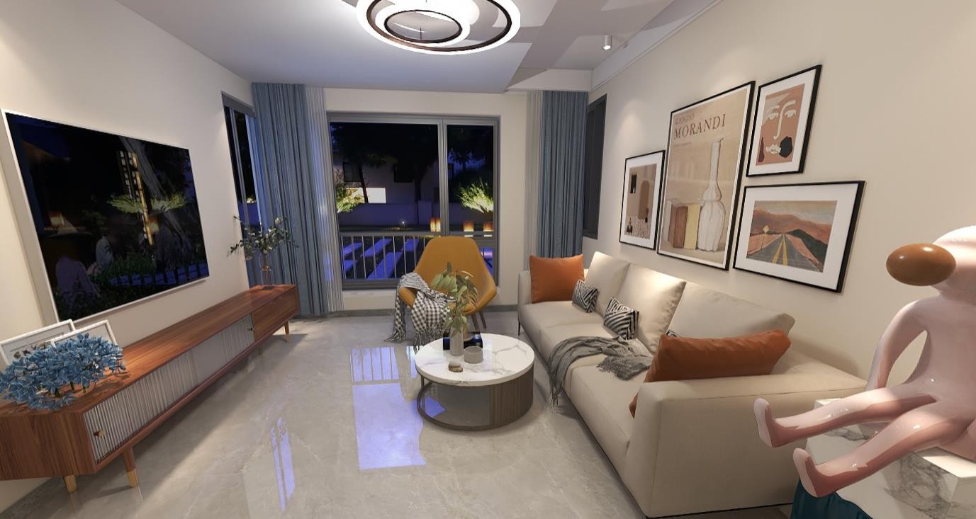 客厅采用灰色的地砖和米色的墙面,搭配各种家具让空间整体显得温馨不冷冽。