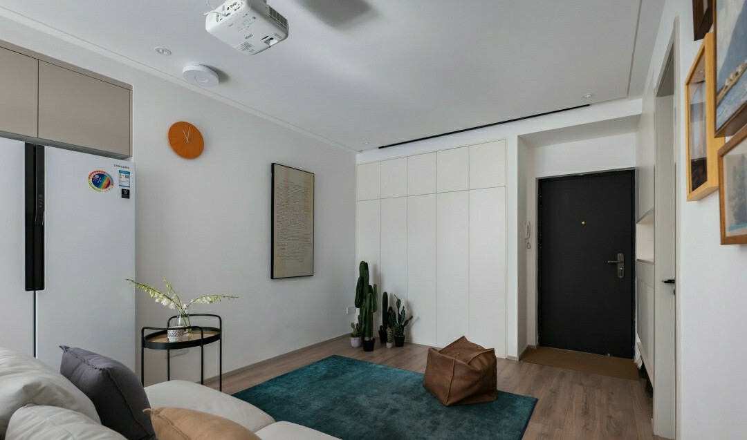 没有传统的电视背景墙,做了满排的储物柜,与入室门厅的鞋柜相呼应,大大提高了空间利用率,满足了小户型收纳的需求!