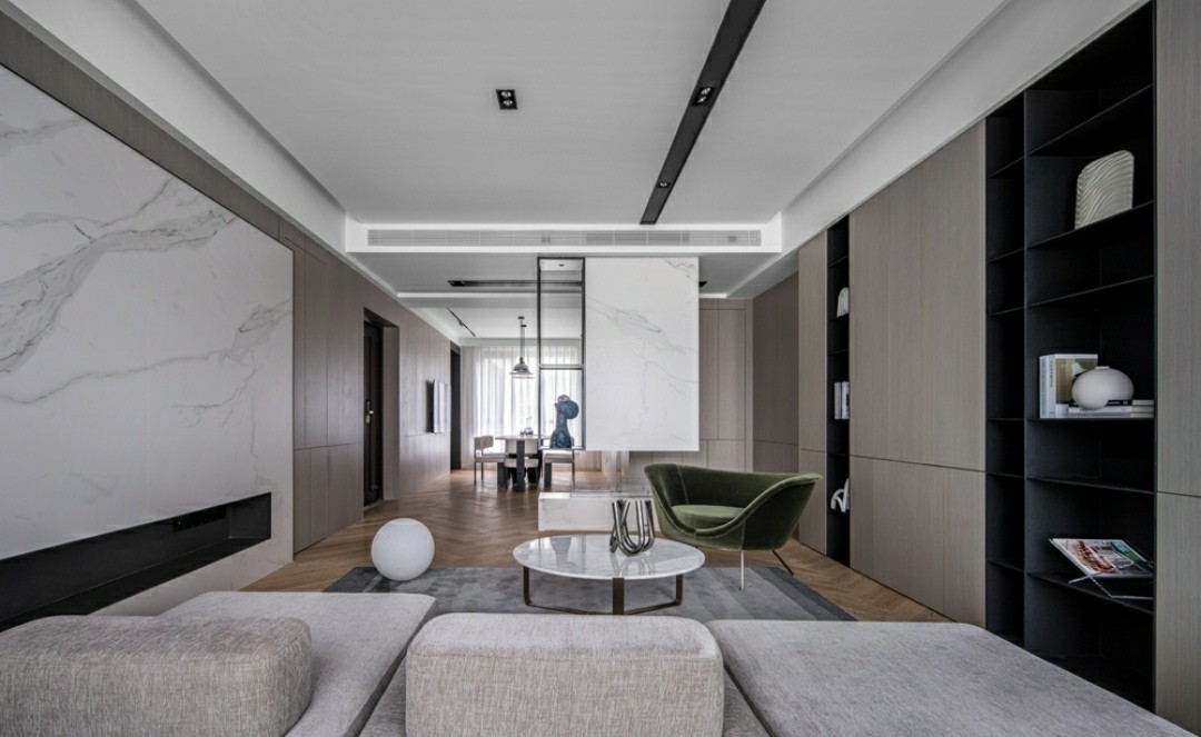 原客厅面积较大,略显空旷,我们以入户门体为基准线,巧设端景,独立分离走廊与客厅,空间视距更为合理,满足视觉美感。