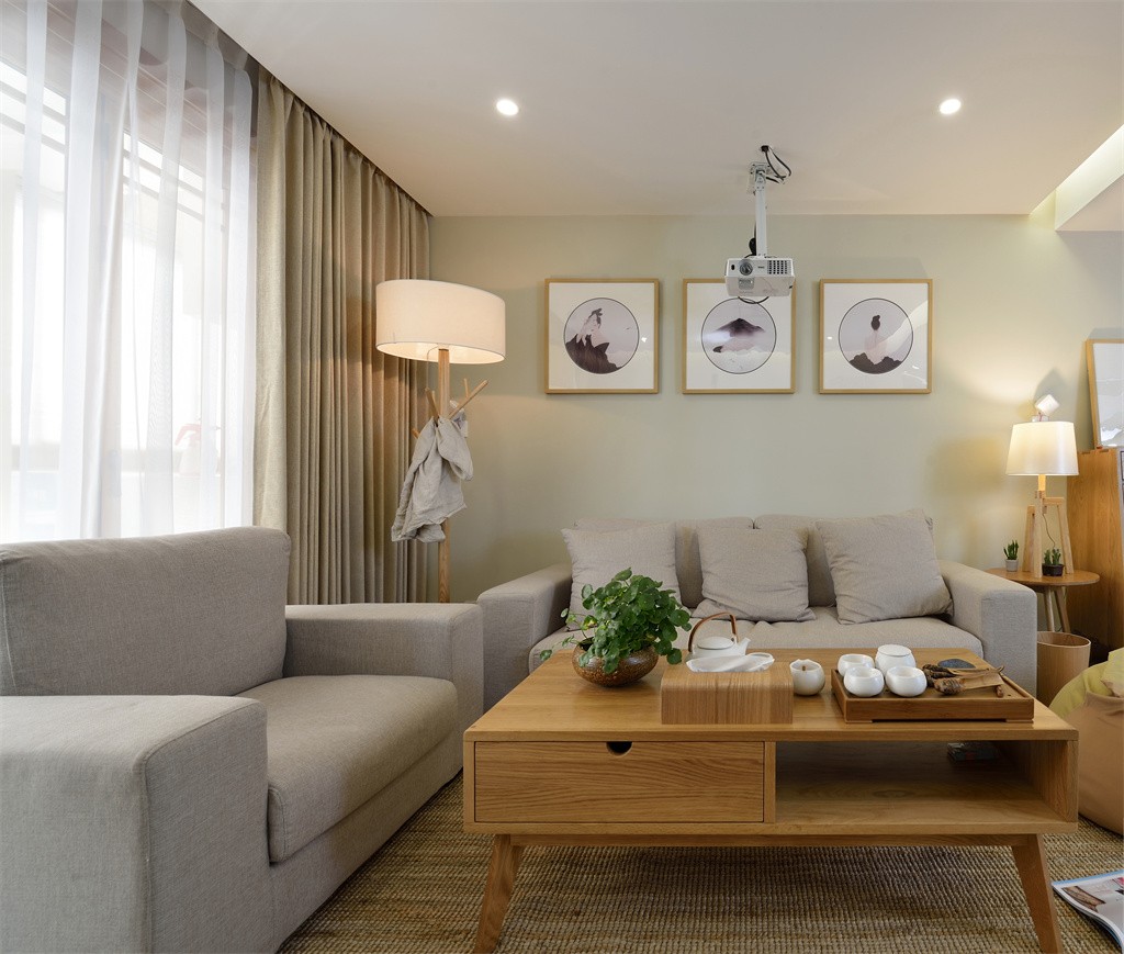 沙发背景的水墨色挂画很有禅意素雅质感,沙发角落的落地灯增加氛围。