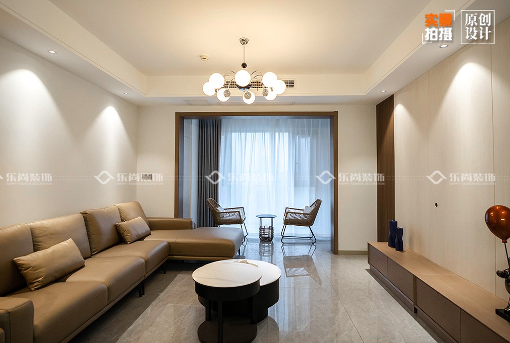 棕色系皮质沙发搭配双圆茶几,让客厅空间充满自然韵味,大幅精美艺术挂画彰显艺术格调,简约的暖光落地灯立于沙发一角,照亮客厅温情氛围。