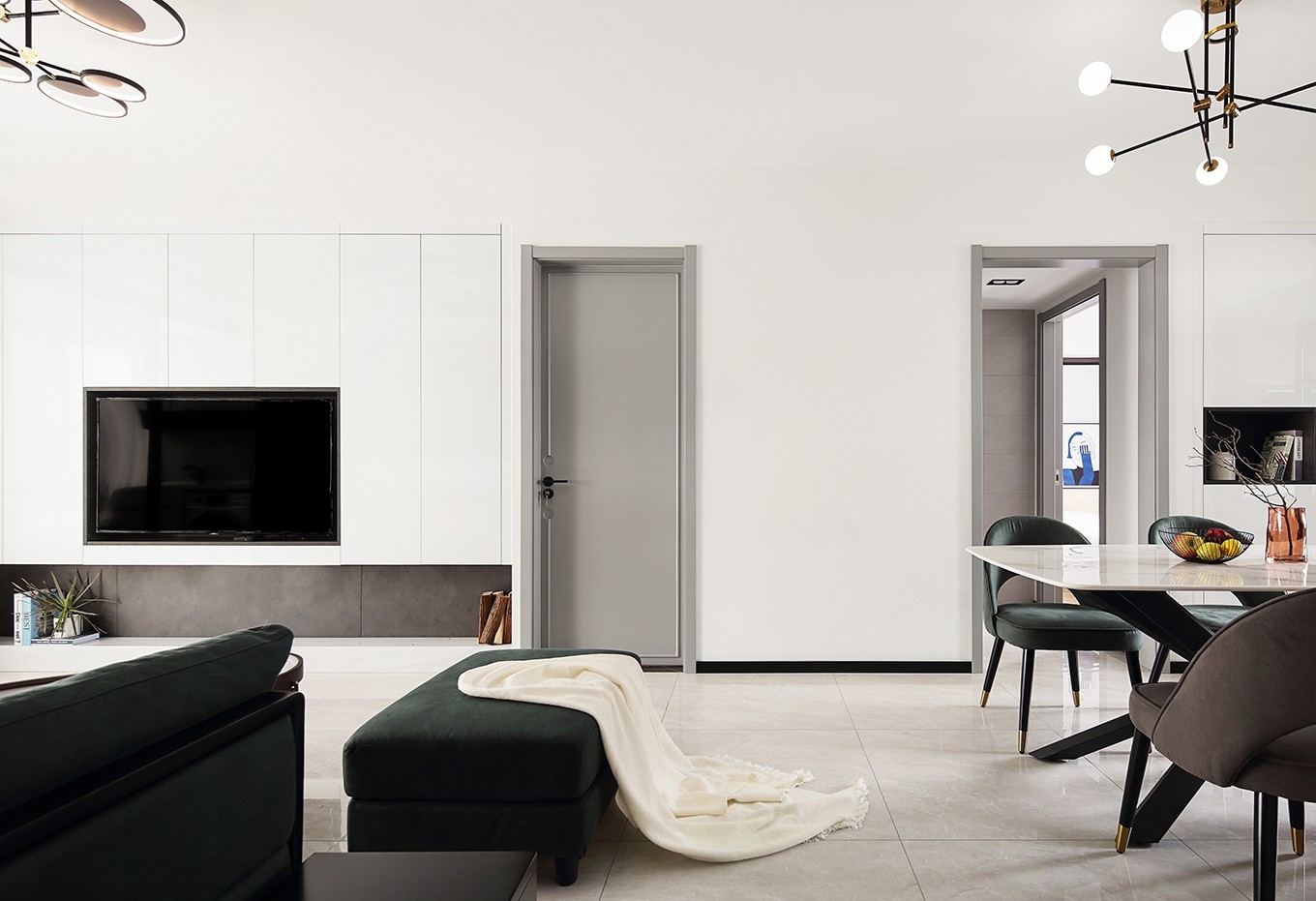 现代风格总能以简洁的造型、流畅的线条打动人心。去掉一切不必要的修饰,尽可能的表达纯粹的居住空间。一整面储物式电视背景墙,满足了收纳和空间装饰的双重需求。电视墙的白,与空间蓝、灰色彼此呼应,形成友好的色彩过度
