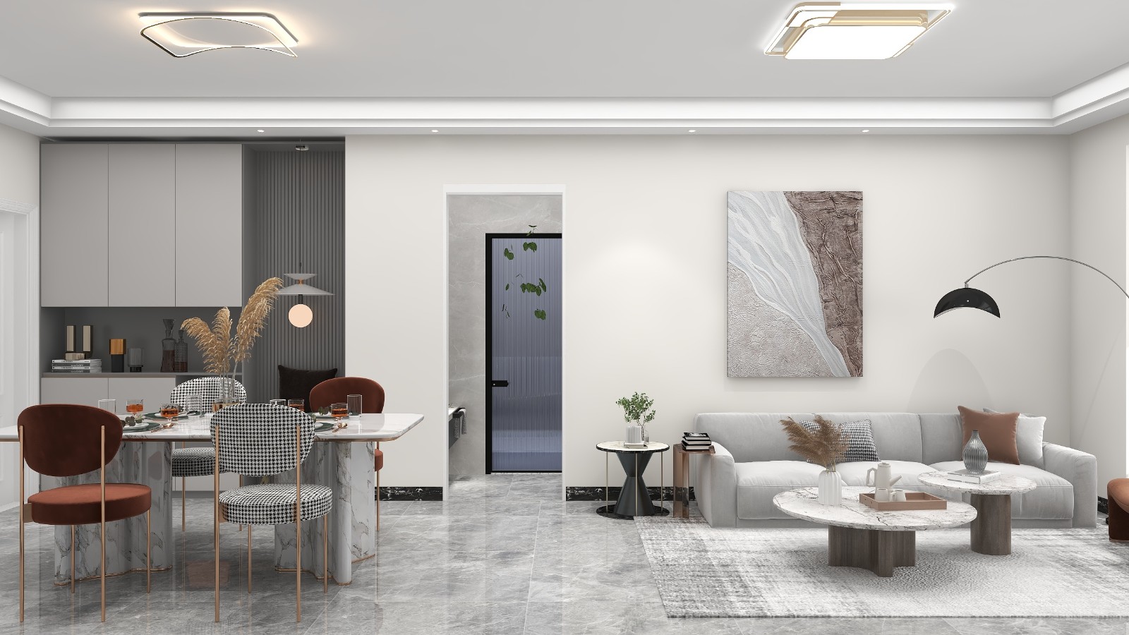 客厅的区域主要以现代风格的元素为主,颜色墙面设计的是一个淡淡的奶油色,显得空间感不会特别的单调,沙发选择的是一个浅浅的灰色,抱枕选择了一些颜色的跳跃