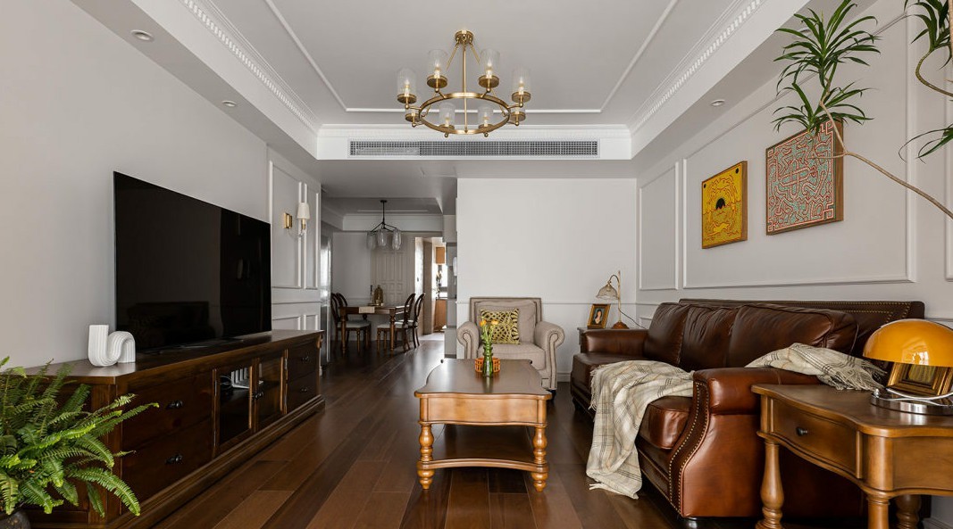 蜡皮的沙发与原木的茶几电视柜共同展现出复古的气息,又搭配上布艺的沙发以及沙发背景墙上波普风格的装饰画,使得客厅艺术气息满满。