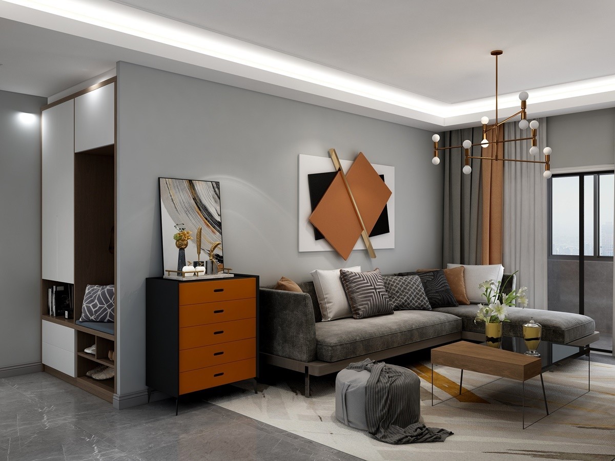 客厅空间使用非常大胆的对比色,爱马仕橙在一片灰色的世界中显得格外的亮眼。 随处可见的爱马仕橙给清冷的空间,注入了活力。