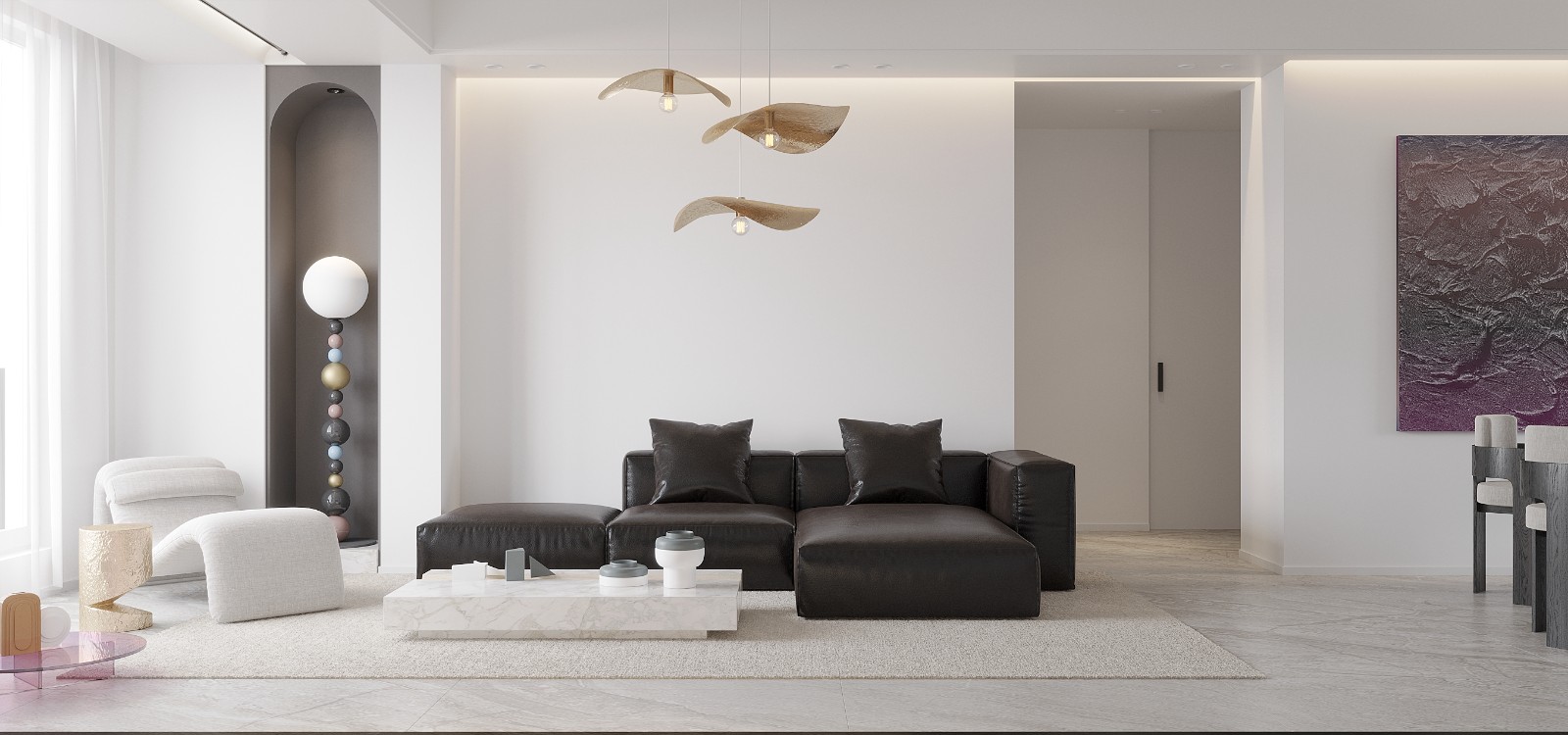 沙发背景没有多余繁杂的设计,金色吊灯与灯带变成了恰到好处的点缀,此时背景之“白”变成了画中一部分。