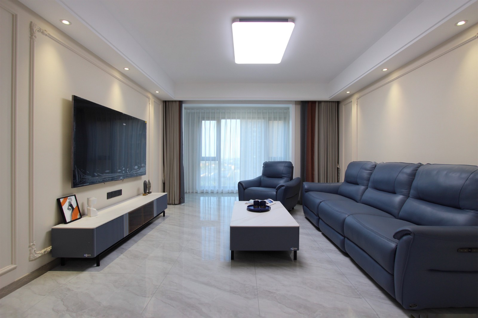 不同深浅度的蓝色家居搭配在一起,给客厅带来了十足的现代感,沙发、茶几的色彩让客厅拥有了更加清爽的气息。