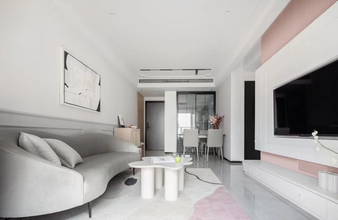 我们将内阳台改造程了两人同时使用的独立书房,成功令三房结构变成了四房,满足业主使用需求。室内整体以白色+灰为基底,局部脏粉色装点,运用艺术漆、栅格、石膏线与布艺等多种材质,在线条与纹理之间有序交叠,生活的温暖与质感也随之升温。