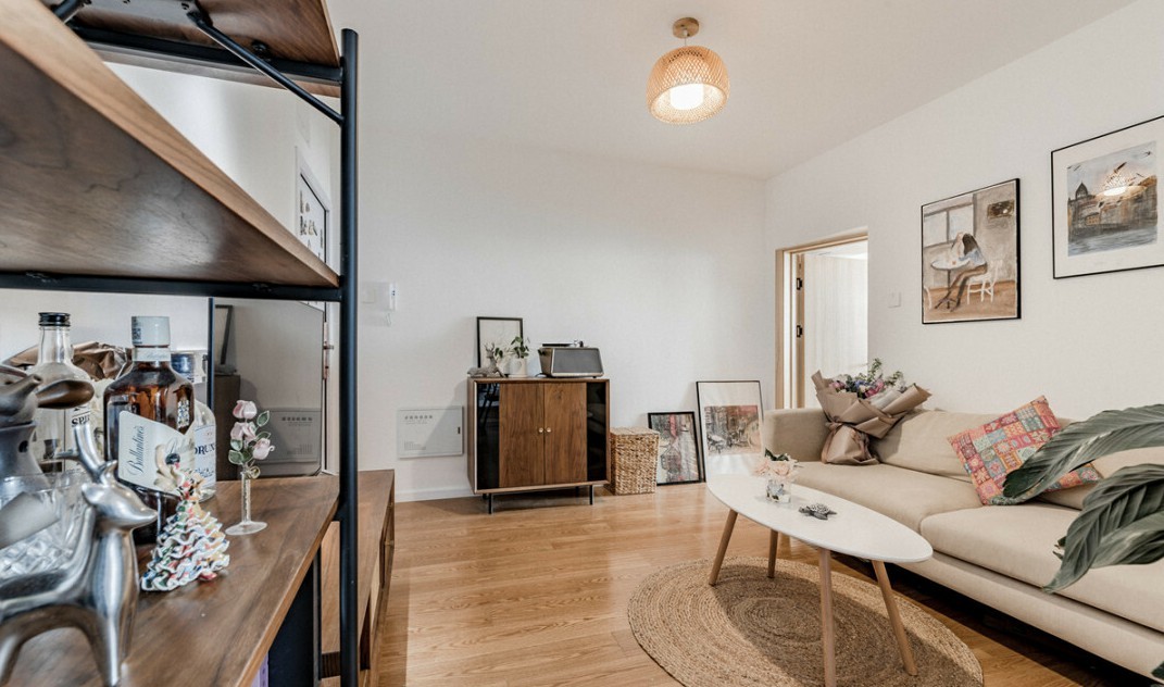 入户便是客厅,深木色的五斗柜上摆放着留声机,奶咖色的沙发搭配白色茶几,与暖色木地板形成对比却又在同一色系中,使空间中的颜色统一而不失变化。