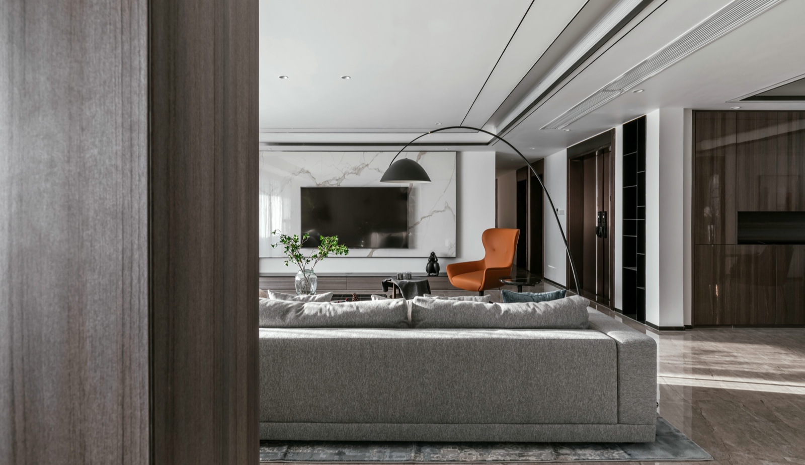 全屋吊顶设计加金属扣条,电视背景墙选用石纹大块岩板。