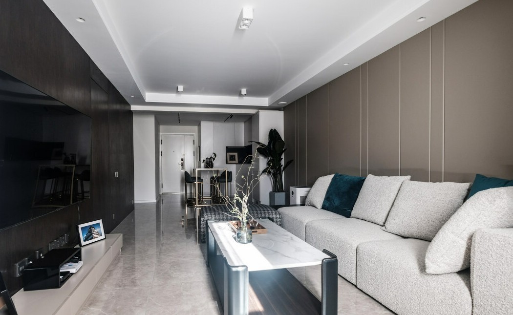 暖灰色沙发背景墙本身的沉稳素雅,将客厅渲染的气质不凡。同时将视线拉伸,整体具有很强的立体层次感。