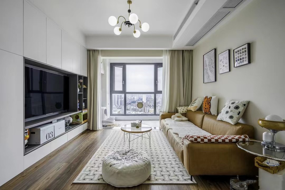 电视背景墙选择了做电视柜,用空间点缀空间,集收纳和展示于一体,这设计真是被玩儿明白了。值得注意的是下方做了悬空设计,打扫起来不要太方便。