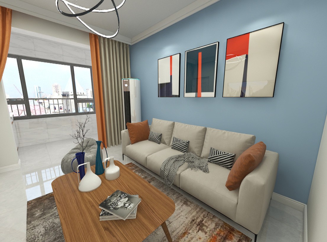 此图为客厅效果图,背景墙用跳色来做装饰。