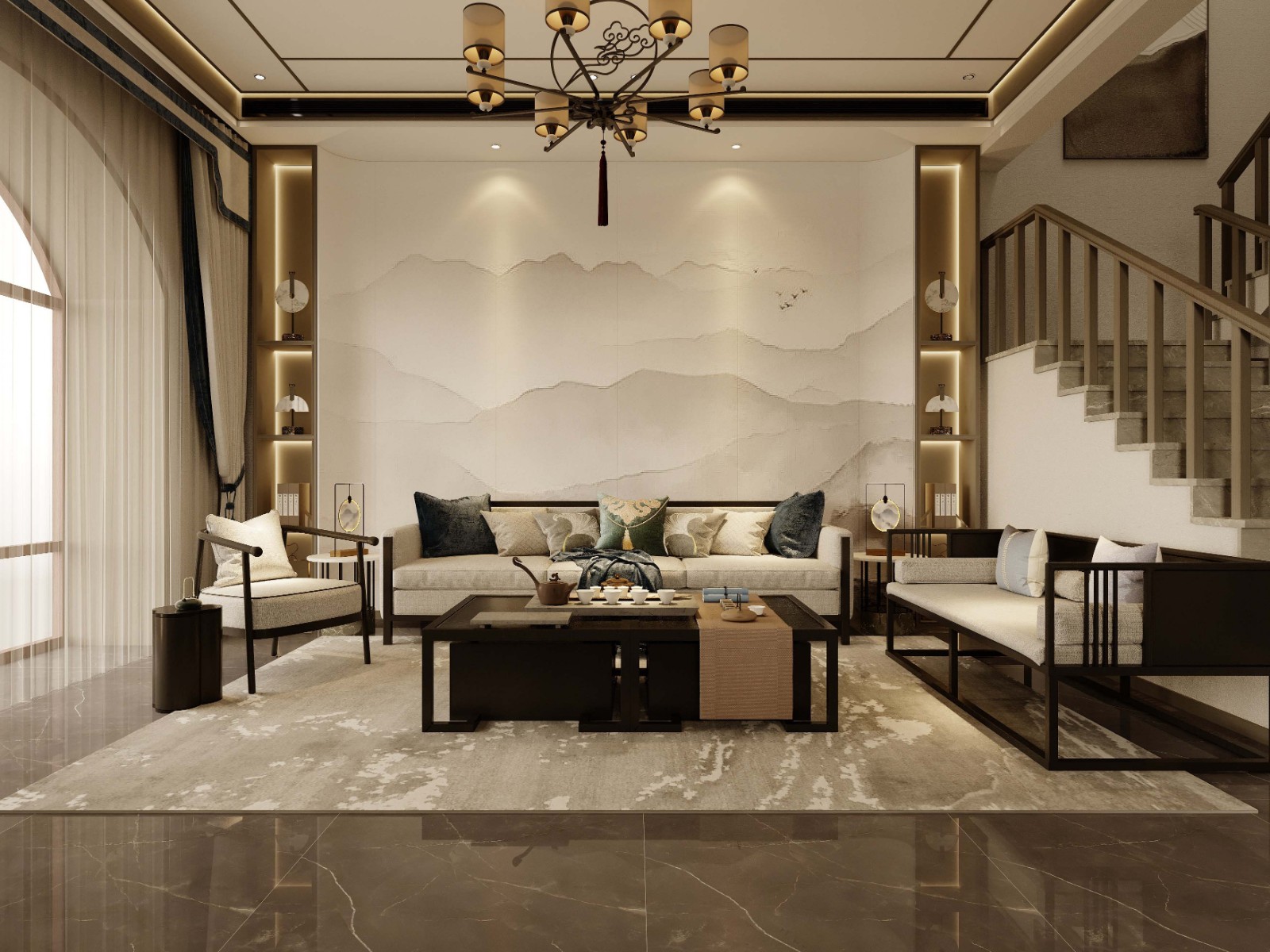 整体风格为新中式,无主灯设计,深色系木纹。