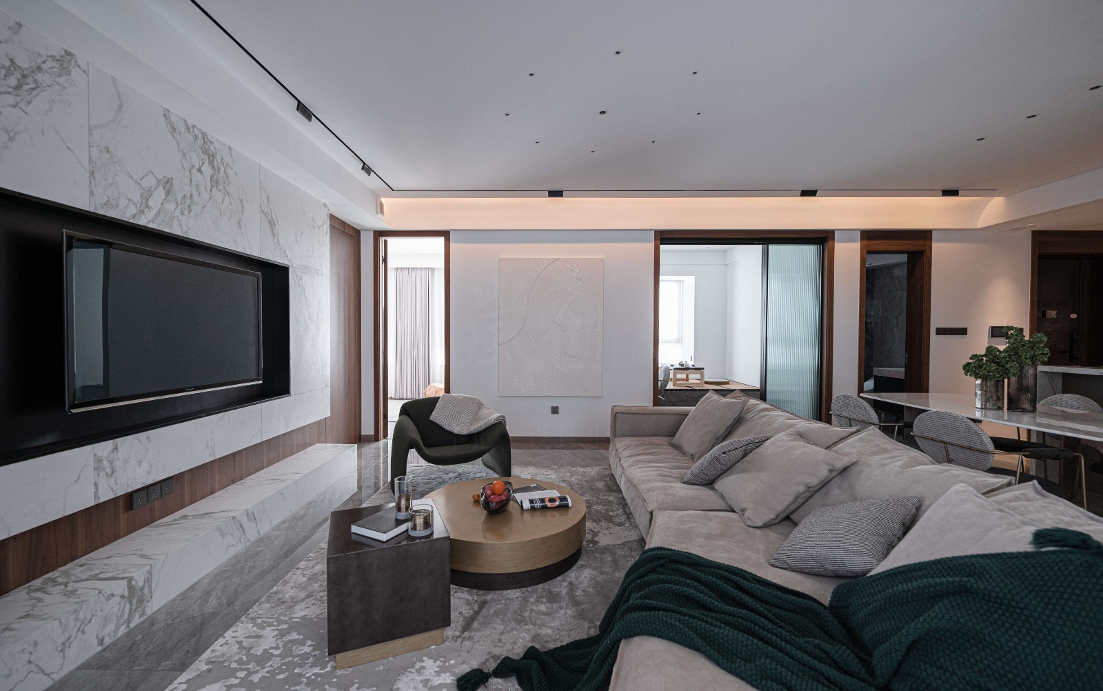 客厅结合轻奢与简约的经典元素,设计风格尽量简约大气,每一处都流露出精致与质感,围绕吊顶的轨道射灯,轻松诠释空间的格调与优雅气质。 岩板电视背景墙纹理细腻自然,提升整体空间的质感和层次感。电视背景墙旁的隐形门完美隐藏,模糊空间界限的同时,更具设计感。