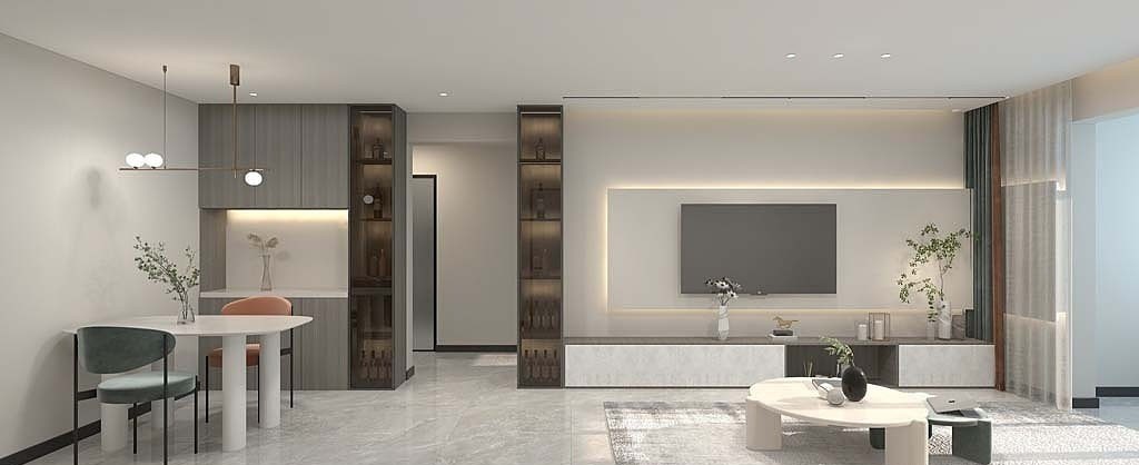 为了突显整个空间的科技感将背景墙做了L造型设置暗藏灯带,既能体现***感的照明氛围,同时也能达到灯光的层次感,酒柜的开放格内部灯光更具备层次保证照明效果,也具备高颜值的气质同时,木作定制选择着色重的北欧西亚胡桃做对比凸显视觉效果,加上很有质感的岩沙浅灰石纹做过度色,色调就类似牛奶与咖啡融合后的奶咖空间,充斥着暖咖的基调,充满温度柔软的气氛感,让科技感与奶油风的完美结合。