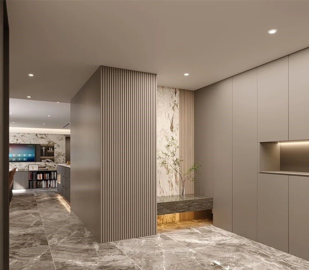入户做了玄关,对原本的长走廊切割开,更加的实用,考虑到老人家换鞋的问题,柜子内做了隐藏式的换鞋凳,开门即可自动展开。