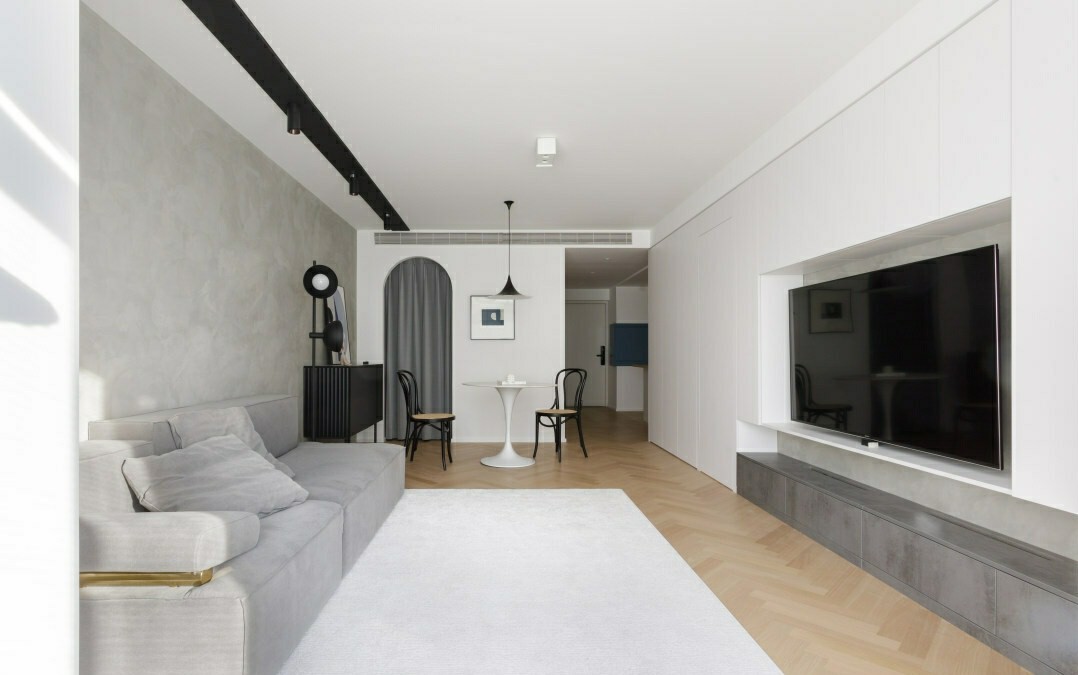 改造后的平面布置图: 1.将厨房变为开放式,增加岛台和整体储物功能。 2.扩大卫生间,形成淋浴、马桶、洗漱、洗衣四室独立。 3.进门右手边增加鞋柜、衣柜的收纳,以及隐蔽冰箱的同时增加步入式杂物间。 4.将客厅电视墙作为整面柜体处理。 5.主卧室床头让开窗户,以地台分隔形成睡眠区和衣帽间。 6.第二间卧室作为书房、客房、储物间和未来儿童房使用。