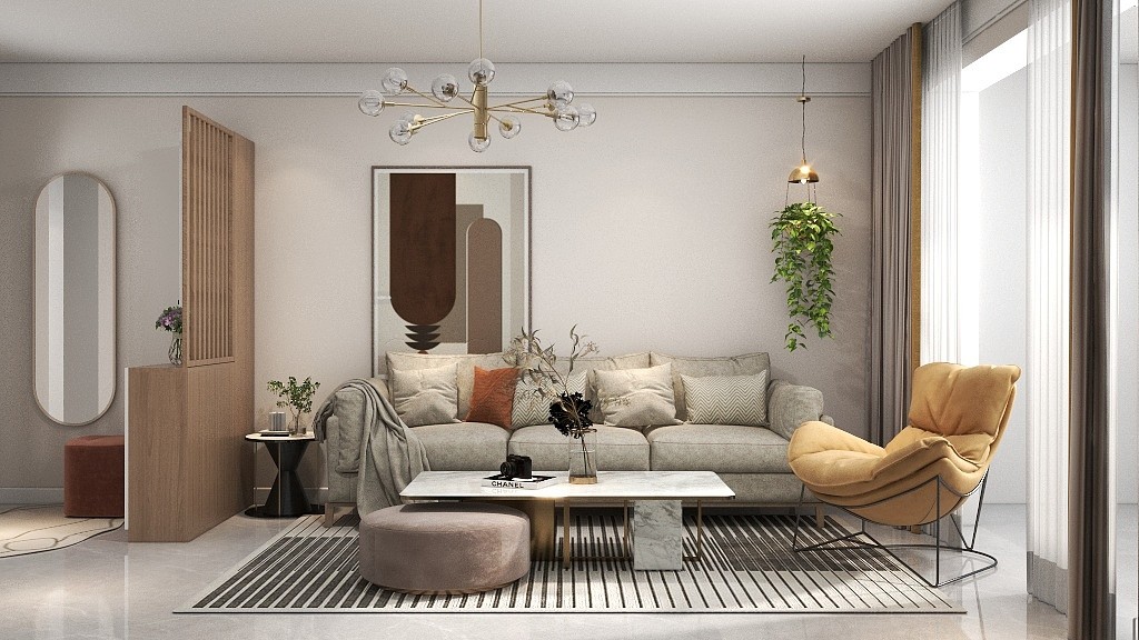 客厅做了成品鞋柜的设计,刚好遮挡沙发添加隐私感。