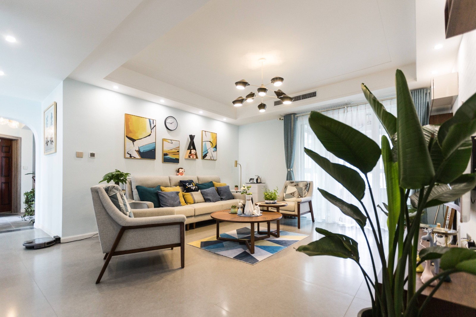 从远处看客厅,虽然没有实体的隔断,但各个空间的划分很明确。客厅和过道利用吊顶做区分,仔细看也会发现玄关处做了拱形门洞,别具一格的弧面设计给空间带来的是不可忽略的设计感和温情,用弧度创造温度。 地面则是通铺的浅灰色地砖,顶、墙、地三面用线条和色块来区分,简约中透露着***的奢华。