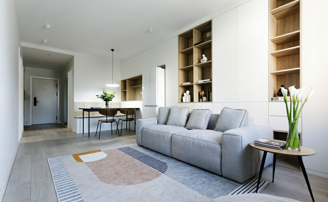沙发背景墙,设计成整柜,柜体从窗边一直延伸至餐厅,增强了两处空间的联动。