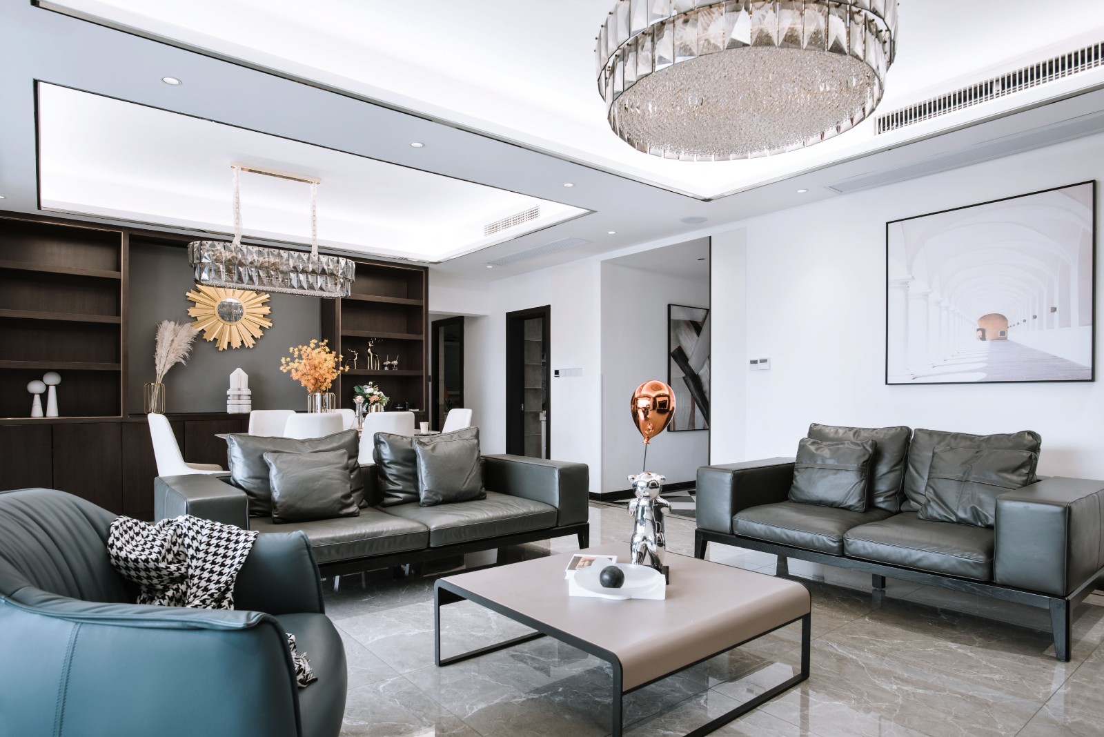 餐边柜在色彩和材质上也都跟电视背景墙做了前后呼应,中间偶尔用一些小巧精致的金属摆件做点缀,提升家居品位和时髦都市感。