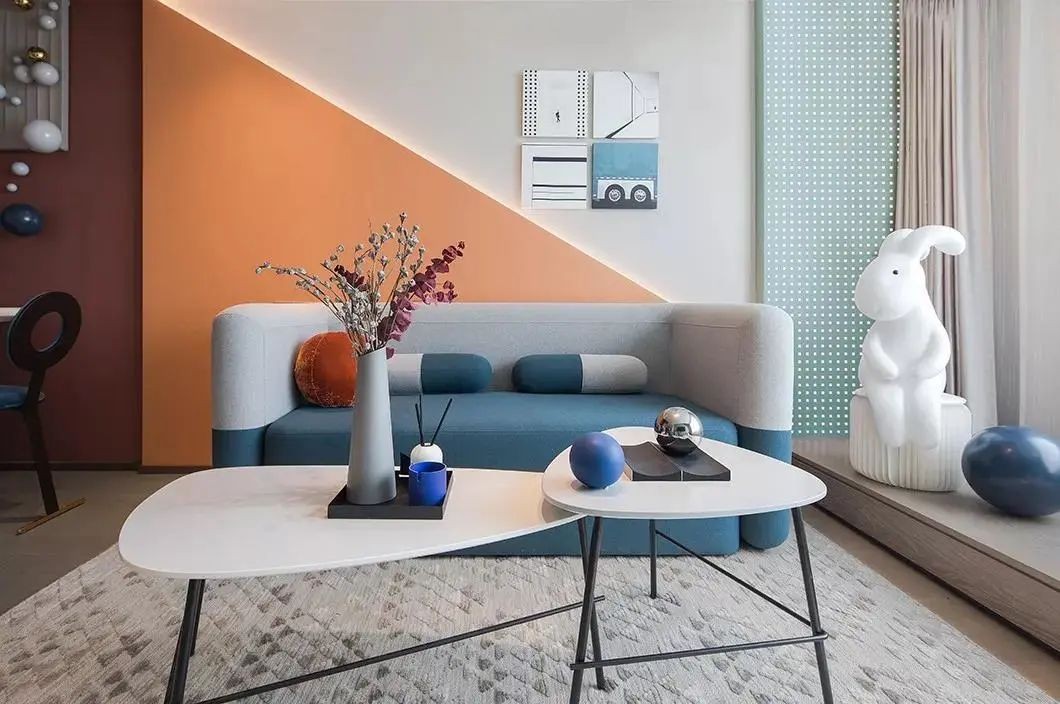 整体空间采取现代风的简洁设计为主,给人以轻松舒适的氛围;而在软装搭配方面,则是加入了活泼丰富的配色,让空间显得更加鲜艳而又有趣。