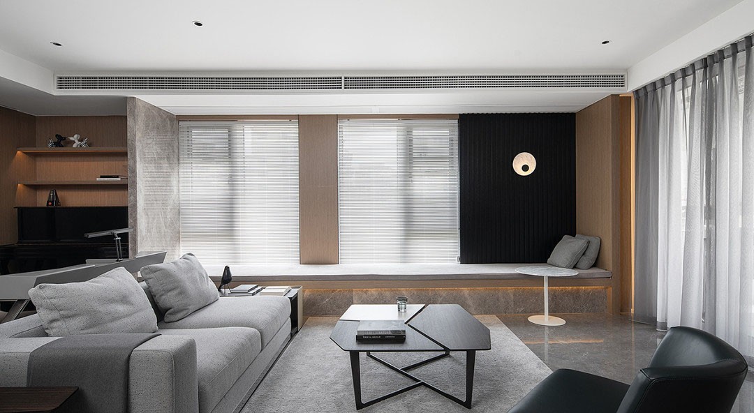 阳台处通铺的坐塌,让整个空间脱离了平整死板,显得更加立体。石材与木材的融合设计,搭配金属线条和玻璃柜门,精致的装修设计,烘托出非凡的艺术质感