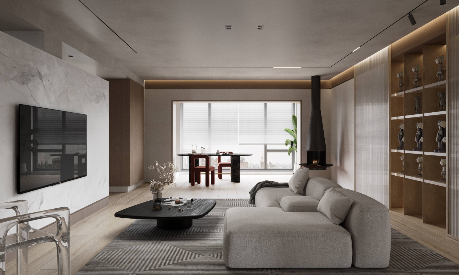 墙面顶面均使用艺术漆饰面,餐边柜也是相近色格栅门板,与沙发背后呼应,赭石色手绘油画,给纯净的空间增添一丝色彩,搭配磁吸轨道灯,很好的融合侘寂美学和简约主义