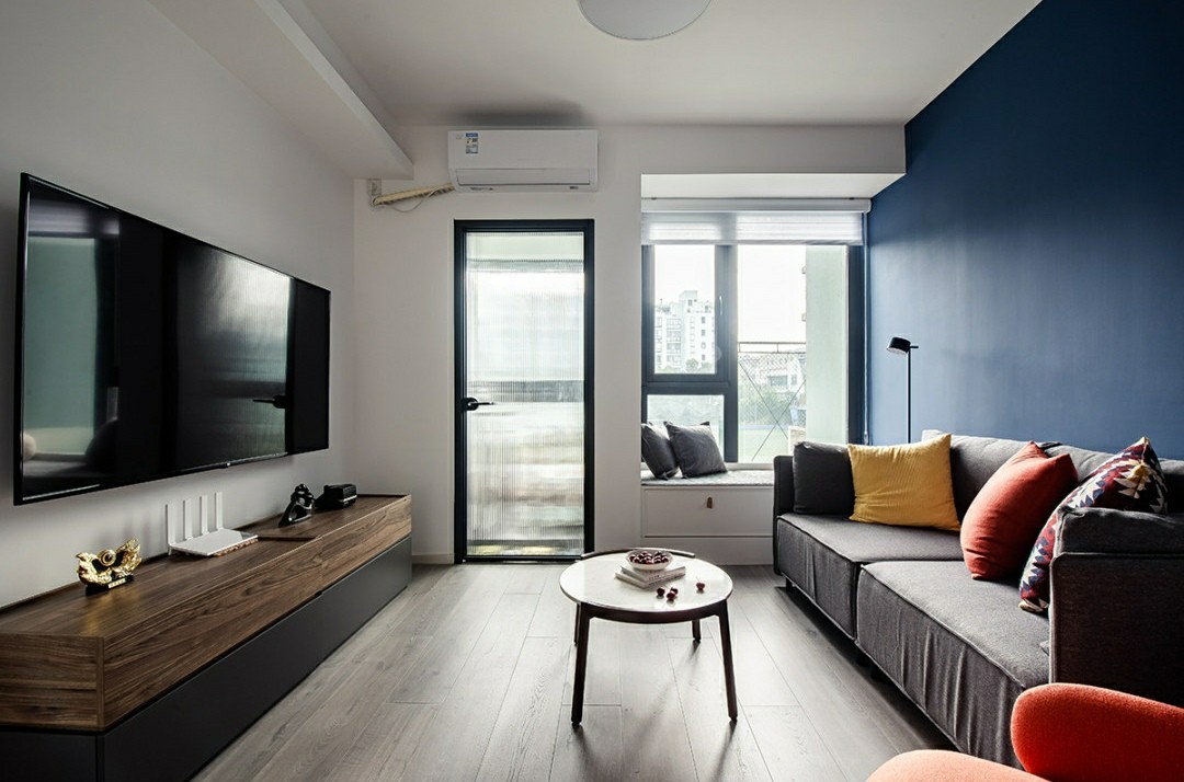 透明的壁灯,深灰色沙发,一束红豆在蔚蓝的墙面前自然舒展,沙发后偷偷探出落地灯,空气里隐约透露的年轻态,并不会流于浮华,而是有千帆过尽,心中仍保有乐观和理想的洒脱感。