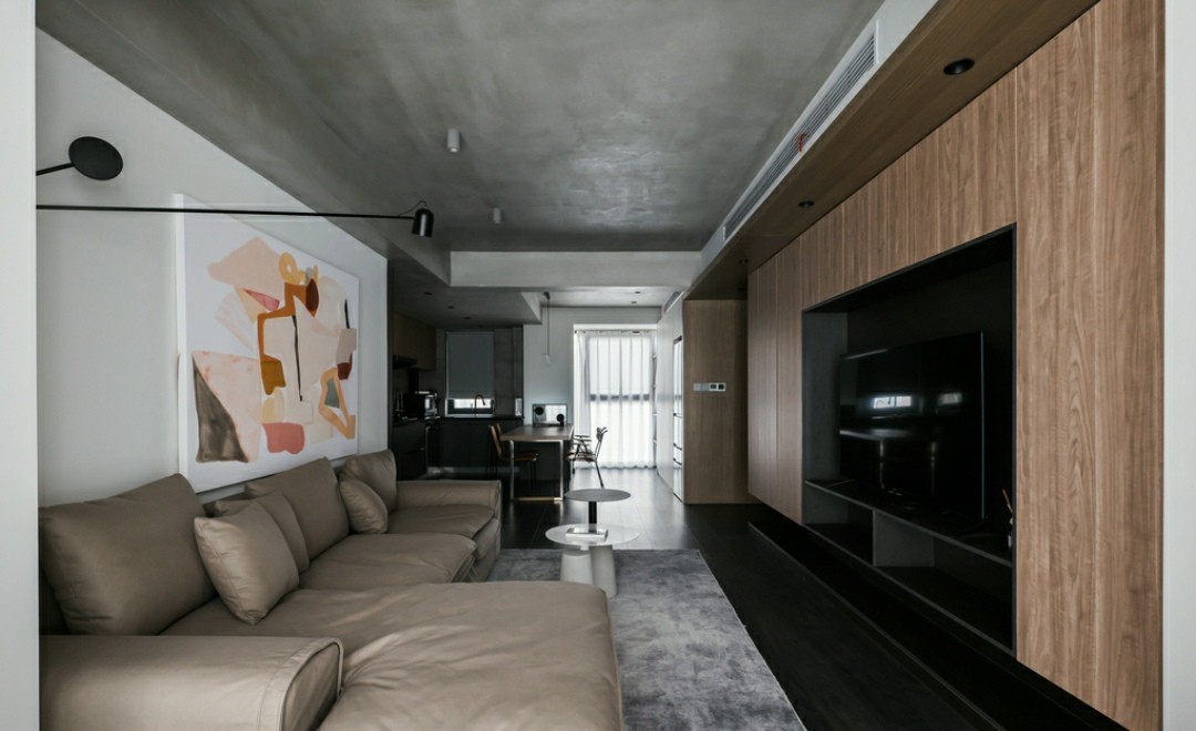 整个厅的顶面采用水泥漆处理方式,加入工业风的极简;为了让整个空间更加通透一点,整个电视墙柜体的设计做了悬空的处理