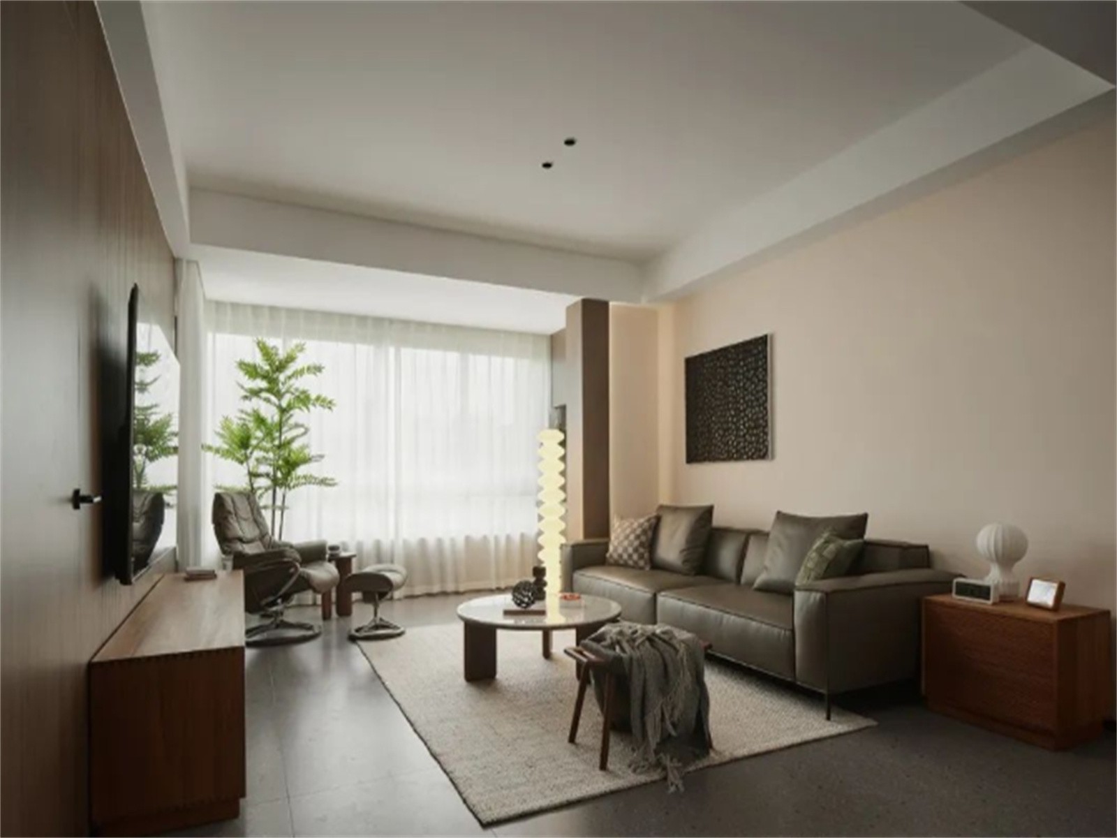 以胡桃木色为基调,家具围合摆放,搭配简洁的软装和榆木元素,营造一个本真舒适的起居空间