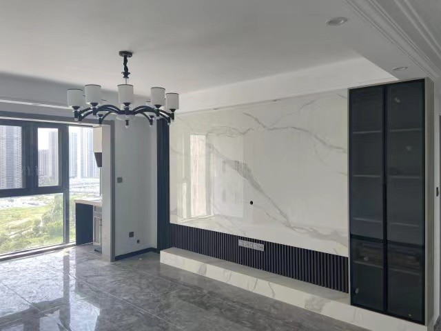 背景墙才用了岩板、木格栅及展示柜一体背景墙